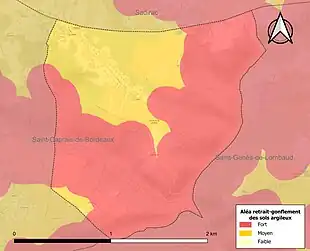 Le retrait-gonflement des sols argileux est susceptible d'engendrer des dommages importants aux bâtiments en cas d’alternance de périodes de sécheresse et de pluie. La totalité de la commune est en aléa moyen ou fort (67,4 % au niveau départemental et 48,5 % au niveau national). Sur les 105 bâtiments dénombrés sur la commune en 2019, 105 sont en aléa moyen ou fort, soit 100 %, à comparer aux 84 % au niveau départemental et 54 % au niveau national. Une cartographie de l'exposition du territoire national au retrait gonflement des sols argileux est disponible sur le site du BRGM[18],[Carte 2].