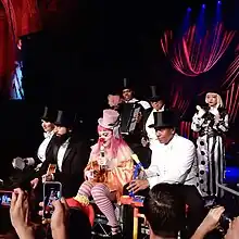 - (en) Nick Levine, « Madonna joue habillée en clown et monte sur un tricycle pour enfant pour son spectacle Tears of a Clown »