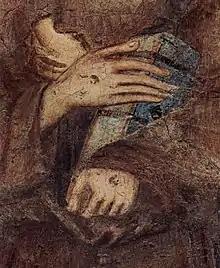 - Les plis du manteau de la Vierge sont plus lâches et ont perdu la forme qu'ils présentent dans la Maestà du Louvre et celle de Bologne.
