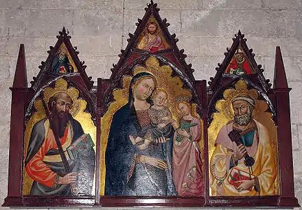 - Un triptyque : Mariage mystique de sainte Catherine (au centre), sur les côtés, Saint Paul (à gauche) et Saint Pierre (à droite), Pieve romanica di San Leolino, Panzano in Chianti.