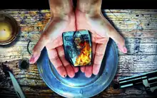 Le parrain prend le doigt « qui presse la gâchette » (l'index) du futur « affranchi » et le perce de manière à faire perler quelques gouttes de sang sur une image d'un saint (la Vierge-Marie ou Saint-François d'Assise). L'image est placée ensuite dans les mains de l'initié et le parrain y met le feu. L'initié doit alors prêter serment et jurer l'omerta. Le serment peut varier d'une famille à l'autre, mais généralement l'initié prononce le serment suivant : « As this card burns, may my soul burn in Hell if I betray the oath of Omertà » (« Comme cette carte qui brûle, que mon âme aille brûler en enfer si je trahis le serment d'Omertà ») ou « As burns this saint, so will burn my soul. I enter alive and I will have to get out dead » (« Comme brûle ce saint, brûlera mon âme. J'entre vivant et je devrai sortir mort »)[8].