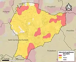 Le retrait-gonflement des sols argileux est susceptible d'engendrer des dommages importants aux bâtiments en cas d’alternance de périodes de sécheresse et de pluie. 96,5 % de la superficie communale est en aléa moyen ou fort (59,3 % au niveau départemental et 48,5 % au niveau national). Sur les 1 490 bâtiments dénombrés sur la commune en 2019, 1 486 sont en aléa moyen ou fort, soit 100 %, à comparer aux 85 % au niveau départemental et 54 % au niveau national. Une cartographie de l'exposition du territoire national au retrait gonflement des sols argileux est disponible sur le site du BRGM[21],[Carte 2].