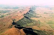Cette érosion est totale pour le Magaliesberg et les anciennes roches sont découvertes à nouveau[33]. Mais le quartzite et le schiste sont aussi soumis à cette érosion qui se poursuit encore aujourd'hui. Le schiste est plus friable que le quartzite mais situé en dessous. L'érosion entraîne des éboulis qui forment les pentes des montagnes[34]. Le quartzite ne possédant plus de support s'effondre à son tour. L'intrusion magmatique de l'« ensemble du Bushveld » avait affaibli le quartzite en le recristallisant : les gros cristaux peuvent être effrités à la main[35]. L'érosion entraîne le recul des montagnes vers le nord et une réduction équivalente de l'altitude de la crête et des vallées[35]. La présence de failles accentue ce phénomène qui est à l'origine de la création des kloofs (ce qui signifie « ravin » en afrikaans). En effet, les zones isolées par les failles subissent une érosion plus forte et plus rapide[36]. Ces failles sont notamment visibles à l'ouest de Rustenburg et à Hartbeespoort où un barrage occupe l'emplacement de la faille[36].