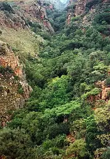 Les kloofs traversés par de nombreux cours d'eau offrent les conditions idéales pour la végétation luxuriante qui y règne toute l'année[100]. La taille des arbres contraste avec les spécimens des milieux plus arides : certaines espèces atteignent une hauteur supérieure à 10 mètres. L'Ilex mitis entre dans cette catégorie puisqu'il peut s'élever jusqu'à environ 20 mètres ; le Pittosporum viridiflorum est plus petit d'une dizaine de mètres[100]. Une espèce de figuier ne se développe que sur les rochers exposés au soleil, ses feuilles sont larges de quinze centimètres[101]. La grande fougère Cyathea dregei qui mesure plusieurs mètres de haut profite de la richesse en eau pour s'installer dans cet endroit[102]. Des droséras vivent dans les ravins : ces petites plantes carnivores sont étendues sur le sol ; leurs feuilles sont couvertes de courts tentacules sur lesquels sont disposés des poils adhésifs. Les insectes qui se posent sur ces feuilles sont piégés et digérés par des enzymes[102].