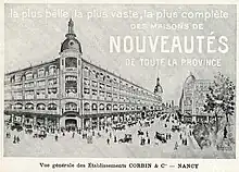 Antoine Corbin, dès l'ouverture de son premier magasin en 1867 - le Bazar Saint-Nicolas - propose d'ailleurs ce type de formule de vente arrivée de Paris et qui fera la fortune des grands magasins; entrée libre, prix fixes, large gamme de vente...[10].