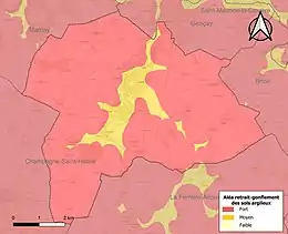Les mouvements de terrains susceptibles de se produire sur la commune sont des affaissements et effondrements liés aux cavités souterraines (hors mines) et des tassements différentiels[16]. Afin de mieux appréhender le risque d’affaissement de terrain, un inventaire national permet de localiser les éventuelles cavités souterraines sur la commune[17]. Le retrait-gonflement des sols argileux est susceptible d'engendrer des dommages importants aux bâtiments en cas d’alternance de périodes de sécheresse et de pluie[18]. La totalité de la commune est en aléa moyen ou fort (79,5 % au niveau départemental et 48,5 % au niveau national)[Carte 2]. Depuis le , en application de la loi ÉLAN, différentes contraintes s'imposent aux vendeurs, maîtres d'ouvrages ou constructeurs de biens situés dans une zone classée en aléa moyen ou fort[Note 3],[19].