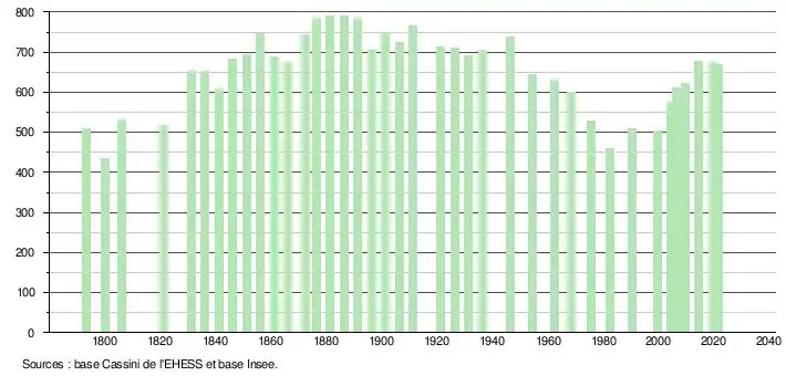 L'évolution du nombre d'habitants est connue à travers les recensements de la population effectués dans la commune depuis 1793. Pour les communes de moins de 10 000 habitants, une enquête de recensement portant sur toute la population est réalisée tous les cinq ans, les populations légales des années intermédiaires étant quant à elles estimées par interpolation ou extrapolation[21]. Pour la commune, le premier recensement exhaustif entrant dans le cadre du nouveau dispositif a été réalisé en 2004[22].