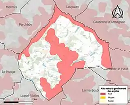 Le retrait-gonflement des sols argileux est susceptible d'engendrer des dommages importants aux bâtiments en cas d’alternance de périodes de sécheresse et de pluie. 39,5 % de la superficie communale est en aléa moyen ou fort (94,5 % au niveau départemental et 48,5 % au niveau national). Sur les 131 bâtiments dénombrés sur la commune en 2019, 78 sont en aléa moyen ou fort, soit 60 %, à comparer aux 93 % au niveau départemental et 54 % au niveau national. Une cartographie de l'exposition du territoire national au retrait gonflement des sols argileux est disponible sur le site du BRGM[24],[Carte 3].