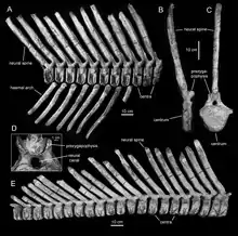 - la base des processus vertébraux des vertèbres caudales distales est fusionnée en une surface concave[1].