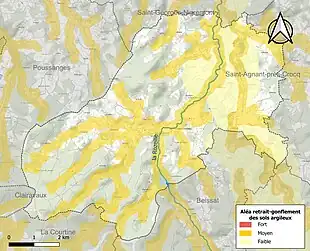 Le retrait-gonflement des sols argileux est susceptible d'engendrer des dommages importants aux bâtiments en cas d’alternance de périodes de sécheresse et de pluie. 39,4 % de la superficie communale est en aléa moyen ou fort (33,6 % au niveau départemental et 48,5 % au niveau national). Sur les 264 bâtiments dénombrés sur la commune en 2019, 92 sont en aléa moyen ou fort, soit 35 %, à comparer aux 25 % au niveau départemental et 54 % au niveau national. Une cartographie de l'exposition du territoire national au retrait gonflement des sols argileux est disponible sur le site du BRGM[19],[Carte 2].