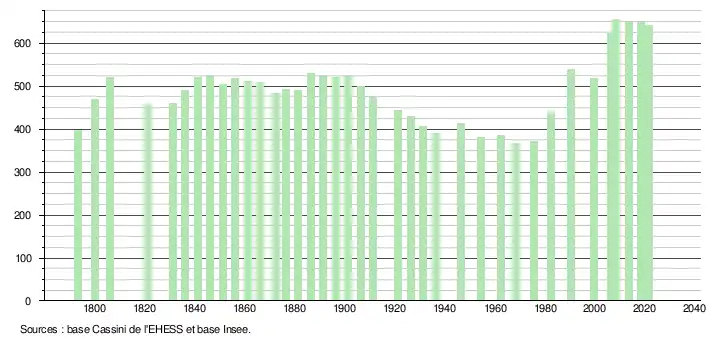 L'évolution du nombre d'habitants est connue à travers les recensements de la population effectués dans la commune depuis 1793. Pour les communes de moins de 10 000 habitants, une enquête de recensement portant sur toute la population est réalisée tous les cinq ans, les populations légales des années intermédiaires étant quant à elles estimées par interpolation ou extrapolation[24]. Pour la commune, le premier recensement exhaustif entrant dans le cadre du nouveau dispositif a été réalisé en 2008[25].