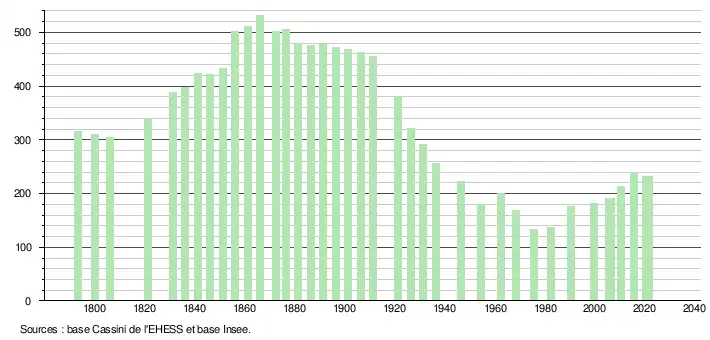 L'évolution du nombre d'habitants est connue à travers les recensements de la population effectués dans la commune depuis 1793. Pour les communes de moins de 10 000 habitants, une enquête de recensement portant sur toute la population est réalisée tous les cinq ans, les populations légales des années intermédiaires étant quant à elles estimées par interpolation ou extrapolation[25]. Pour la commune, le premier recensement exhaustif entrant dans le cadre du nouveau dispositif a été réalisé en 2005[26].