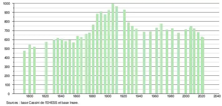 L'évolution du nombre d'habitants est connue à travers les recensements de la population effectués dans la commune depuis 1793. Pour les communes de moins de 10 000 habitants, une enquête de recensement portant sur toute la population est réalisée tous les cinq ans, les populations légales des années intermédiaires étant quant à elles estimées par interpolation ou extrapolation[18]. Pour la commune, le premier recensement exhaustif entrant dans le cadre du nouveau dispositif a été réalisé en 2005[19].