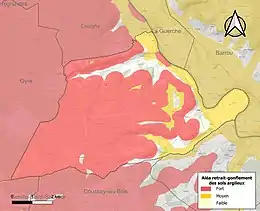 Les mouvements de terrains susceptibles de se produire sur la commune sont des tassements différentiels[21]. Le retrait-gonflement des sols argileux est susceptible d'engendrer des dommages importants aux bâtiments en cas d’alternance de périodes de sécheresse et de pluie[22]. 89,8 % de la superficie communale est en aléa moyen ou fort (79,5 % au niveau départemental et 48,5 % au niveau national)[Carte 2]. Depuis le , en application de la loi ÉLAN, différentes contraintes s'imposent aux vendeurs, maîtres d'ouvrages ou constructeurs de biens situés dans une zone classée en aléa moyen ou fort[Note 5],[23].