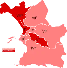 La ville de Marseille est découpée en 16 arrondissements municipaux en 1946. Ceux-ci sont regroupés en secteurs pour l'élection des conseillers municipaux depuis 1964[10]. Depuis 1982, Marseille relève de la loi dite « PML » : chaque secteur (six puis huit à partir de 1987) élit au suffrage universel direct un conseil dont un tiers des membres siège également au conseil municipal. Chaque conseil de secteur élit un maire de secteur et le conseil municipal élit le maire de Marseille.