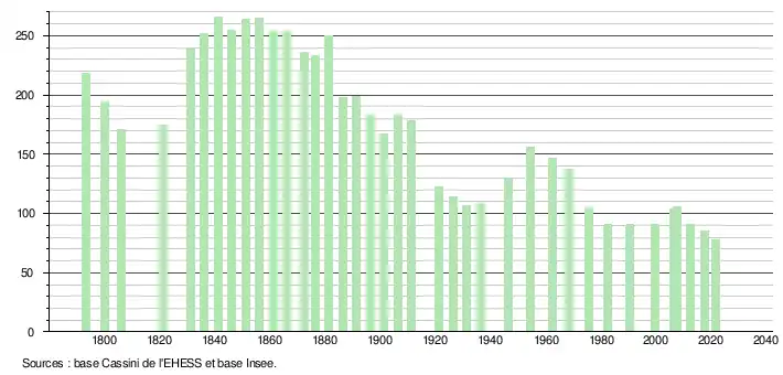 L'évolution du nombre d'habitants est connue à travers les recensements de la population effectués dans la commune depuis 1793. Pour les communes de moins de 10 000 habitants, une enquête de recensement portant sur toute la population est réalisée tous les cinq ans, les populations légales des années intermédiaires étant quant à elles estimées par interpolation ou extrapolation[17]. Pour la commune, le premier recensement exhaustif entrant dans le cadre du nouveau dispositif a été réalisé en 2007[18].