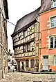 La façade principale de la maison est avec un pignon très élancé avec étages en encorbellement et pans de bois, au-dessus d'un rez-de-chaussée en pierre. Il semble que le rez-de-chaussée ait été refait au XVIe siècle, avec pilastres et corniche, frise ornée[1].
