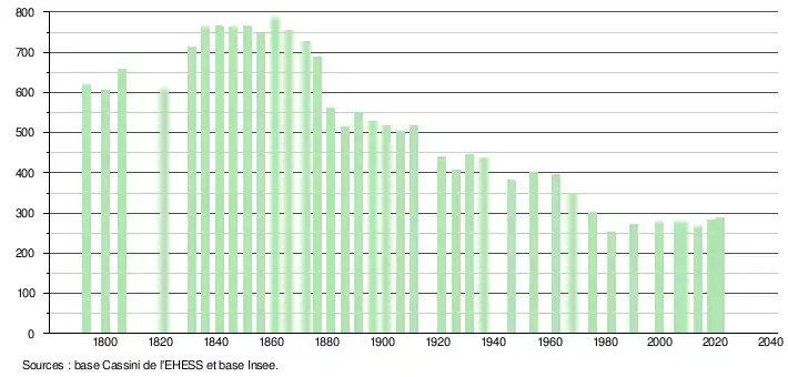 L'évolution du nombre d'habitants est connue à travers les recensements de la population effectués dans la commune depuis 1793. Pour les communes de moins de 10 000 habitants, une enquête de recensement portant sur toute la population est réalisée tous les cinq ans, les populations légales des années intermédiaires étant quant à elles estimées par interpolation ou extrapolation[28]. Pour la commune, le premier recensement exhaustif entrant dans le cadre du nouveau dispositif a été réalisé en 2008[29].