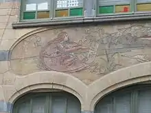 Entre ces baies en triplet, un immense sgraffite un peu défraîchi s'étend sur la quasi-totalité de la façade.