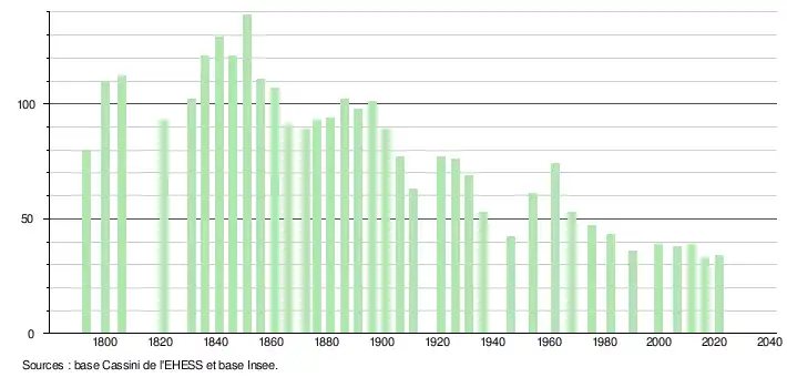 L'évolution du nombre d'habitants est connue à travers les recensements de la population effectués dans la commune depuis 1793. Pour les communes de moins de 10 000 habitants, une enquête de recensement portant sur toute la population est réalisée tous les cinq ans, les populations légales des années intermédiaires étant quant à elles estimées par interpolation ou extrapolation[16]. Pour la commune, le premier recensement exhaustif entrant dans le cadre du nouveau dispositif a été réalisé en 2006[17].