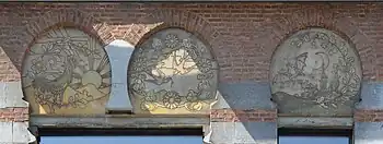 Les baies de l'étage sont surmontées de trois arcs outrepassés légèrement brisés ornés de sgraffites figurant des allégories du Matin (le coq saluant le soleil levant), du Jour (des hirondelles volant dans le ciel) et de la Nuit (des chauves-souris volant dans un paysage éclairé par la lune).
