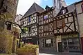 Maison de la fin du XVe siècle, avec un rez-de-chaussée en pierre et un premier étage en bois. Poteaux et sablières moulurés. Pignon agrémenté de deux aisseliers courbes, d'un faux entait et d'un poinçon. Les espaces triangulaires compris entre ces différentes pièces et la première ferme de la charpente sont trilobés. De petits motifs de bois polylobés décorent les aisseliers. Le poteau cornier porte une niche ornée d'accolades et de fleurons[1].