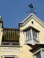 La façade se termine par un pignon à angle aigu dont la partie inférieure gauche est coupée net pour laisser la place à une terrasse sous verrière de teinte jaune. Deux petits hiboux sculptés dans la pierre occupent les parties latérales de la terrasse. Un iris en fer forgé domine le pignon.