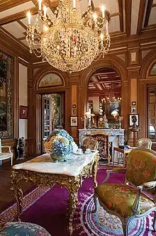 Le salon comporte un beau mobilier, majoritairement du XVIIIe siècle, ainsi qu’un lustre imposant électrifié qui conserve trois ampoules tricolores de l’époque de Louis Mantin. Autre particularité, la vitre au-dessus de la cheminée qui donne un point de vue direct sur le bureau. Pièce de travail, le bureau s’affirme comme tel par son atmosphère toute différente de celle du salon. Les boiseries cirées sont omniprésentes, rappelant l’intérêt du propriétaire pour ce matériau. On y trouve un bureau massif en bois sculpté et une bibliothèque. Enfin une cheminée monumentale, puisant largement dans le vocabulaire ornemental de la Renaissance, présente, incrustée en son centre, la reproduction d’une toile hollandaise en faïence de Delft. La plaque de cheminée, massive, offre à la vue de tous un « M » stylisé.