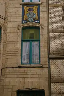 La travée de gauche comporte une baie avec deux meneaux en pierre qui deviennent des consoles soutenant la fenêtre arquée à base trapézoïdale du premier étage. Ce dernier est surmonté d'un balcon concave en pierre et ferronnerie. La baie du deuxième étage forme un arc en plein cintre. La façade est signée par l'architecte en dessous et à gauche du bow-window.