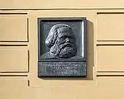 Une plaque commémorative avec un relief du visage de Karl Marx est apposée sur la façade. Elle rappelle qu'à cet endroit, dans l'ancienne pension Germania, Marx résidait ici lors de ses trois séjours thermaux en 1874, 1875 et 1876[2]. Il a d'ailleurs son monument dédié à Karlovy Vary. Le bâtiment s'appelait pour cette raison Bains Marx après la Seconde Guerre mondiale.