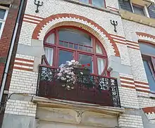 L'élément le plus remarquable de cette façade est la grande baie vitrée du premier étage de la travée de gauche. Elle a la forme d'un arc outrepassé surmonté aussi d'une double ligne des deux types de briques. Les vitres sont divisées par des petits bois dont certains prolongent l'arc outrepassé. Un balcon en fer forgé aux motifs végétaux précède cette baie et une sculpture représentant une oie aux ailes déployées tenant un ver dans son bec se situe sous ce balcon. Deux clés d'ancre en forme de trident ornent la partie supérieure de la travée de gauche.