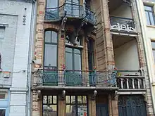 La loggia du deuxième étage est précédée d'un garde-corps où la ferronnerie est complétée par une pierre bleue sculptée aux formes japonisantes tandis que celui du premier étage comporte des piliers en pierre devançant le fer forgé. La porte cochère est décorée d'un fer forgé omniprésent faisant la part belle aux courbes en coup de fouet.