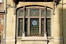 Plus haut, la façade présente une partie en retrait (arrière-corps) qui regroupe la fenêtre du premier étage, précédée d'un balcon aux fers forgés Art nouveau, et celle du deuxième étage, ornée de colonnettes en fer.