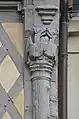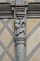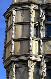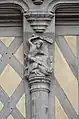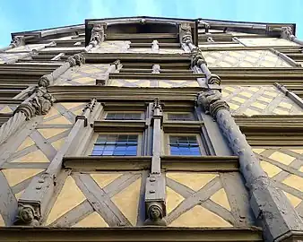 La façade en pan de bois, est décorée de nombreuses sculptures est constituée d'un panneautage à losange dont les hourdis étaient, à l'origine, constitués de briques[2].