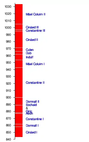 Les rois de la maison d'Alpin se succèdent jusqu'au XIe siècle selon le principe celtique de la tanistrie. voir le schéma de la succession dynastique.