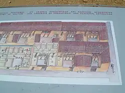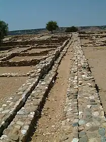 L'habitat s'organise donc autour de grands axes nord-sud et est-ouest qui forment des ilots ou quartiers[2]. Chaque ilot est spécialisé selon sa fonction ou selon la richesse du propriétaire et comporte deux rangées de cinq maisons, séparées par une ruelle « d'aération ».