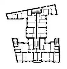 Au centre de l'immeuble se trouve le volume vertical du grand escalier qui divise chaque étage en une partie avant tournée vers la rue et une partie arrière vers la cour.