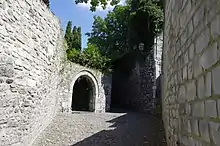 Le long de la rue des Frères-Mineurs, le haut mur en pierre calcaire est percé d'un porche cintré donnant un accès vers la façade arrière du corps de logis.