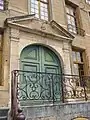 Le bâtiment, donnant rue du Ménil, s'élève sur deux étages, avec un portail à pilastres cannelés surmonté d'un fronton brisé. Le rez-de-chaussée est surélevé, d'où un escalier droit en U avec rampe en fer forgé pour accéder au portail. Trois lucarnes à fronton triangulaire éclairent les combles. La date de construction de ce bâtiment, 1629, est indiqué par les têtes de tirants métalliques en façade[1].
