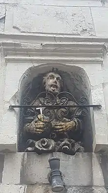 Cette sculpture en bois d'homme barbu vêtu d’un habit monacal tient dans la main droite un globe terrestre surmonté d’une croix. Il est daté de 1562 et est connu dans la région comme Lu Vî Bon Dju (Le Vieux Bon Dieu en wallon) ou le Père éternel. Il se trouve au rez-de-chaussée de l'immeuble, sur la deuxième travée, dans une grande niche cintrée en pierre calcaire surmontée d'un larmier[3].