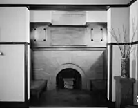 Le foyer et la cheminée sont installés dans un inglenook, mot gallique qui signifie « coin du feu ». Une inscription est gravée sur le devant de la cheminée : Truth is life. Good friend, around these hearth-stones speak no evil word of any creature. (« La vérité c'est la vie. Bon ami, autour de ces pierres de foyer ne prononce aucune parole diabolique d'aucune créature »)