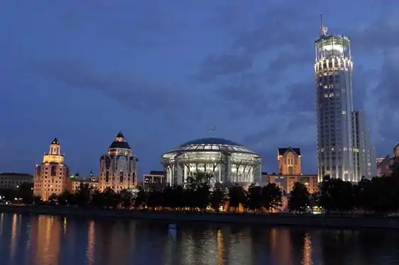 Le complexe est situé le long la rive droite de la Moskova, à l'extérieur de l'anneau des Jardins. Il fait partie d'un complexe baptisé Tours des rives comprenant également des immeubles pour entreprises et des hôtels[1]. Le bâtiment est l'oeuvre des architectes Y. Gnedovsky, V. Krassilnikov, D. Solopov, M. Gavrilova et S. Gnedovsky. Structure d'acier et de verre, il a la forme d'un cylindre surmonté d'un dôme lui-même surmonté d'une clé de sol de 2 mètres de haut faisant girouette et œuvre du sculpteur Zurab Tsereteli. La salle de concert principale est de forme circulaire similaire à celle de la Philharmonie de Berlin. Les spectateurs sont disposés sur deux niveaux et entourent presque complètement la scène. La salle dispose d'une orgue comportant 5500 tuyaux, deuxième du pays par sa taille après celle de la salle de concert Tchaïkovski située également à Moscou.