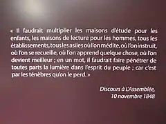 « Victor Hugo est né dans cette maison le 26 février 1802. Cette dédicace dévoilée le 25 février 2002 rappelle au XXIe siècle l'actualité des idéaux et des combats politiques du plus célèbre écrivain de France. Je veux les peuples grands, je veux les hommes libres. »