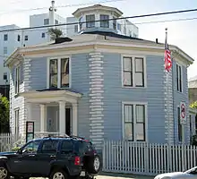 Un agencement similaire du rez-de-chaussée en maçonnerie et du deuxième étage à ossature bois, mais construit dans un style décoratif typique de San Francisco. Feusier Octagon House, San Francisco, California (construite en 1857).