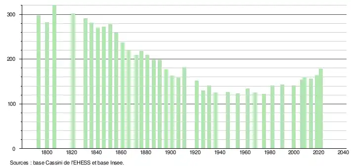 L'évolution du nombre d'habitants est connue à travers les recensements de la population effectués dans la commune depuis 1793. Pour les communes de moins de 10 000 habitants, une enquête de recensement portant sur toute la population est réalisée tous les cinq ans, les populations légales des années intermédiaires étant quant à elles estimées par interpolation ou extrapolation[18]. Pour la commune, le premier recensement exhaustif entrant dans le cadre du nouveau dispositif a été réalisé en 2008[19].
