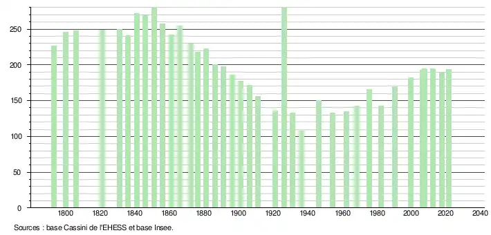 L'évolution du nombre d'habitants est connue à travers les recensements de la population effectués dans la commune depuis 1793. Pour les communes de moins de 10 000 habitants, une enquête de recensement portant sur toute la population est réalisée tous les cinq ans, les populations légales des années intermédiaires étant quant à elles estimées par interpolation ou extrapolation[23]. Pour la commune, le premier recensement exhaustif entrant dans le cadre du nouveau dispositif a été réalisé en 2007[24].