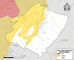 Les mouvements de terrains susceptibles de se produire sur la commune sont des tassements différentiels[17]. Le retrait-gonflement des sols argileux est susceptible d'engendrer des dommages importants aux bâtiments en cas d’alternance de périodes de sécheresse et de pluie[18]. 40,6 % de la superficie communale est en aléa moyen ou fort (79,5 % au niveau départemental et 48,5 % au niveau national)[Carte 2]. Depuis le , en application de la loi ÉLAN, différentes contraintes s'imposent aux vendeurs, maîtres d'ouvrages ou constructeurs de biens situés dans une zone classée en aléa moyen ou fort[Note 3],[19].
