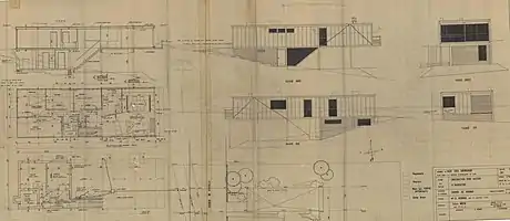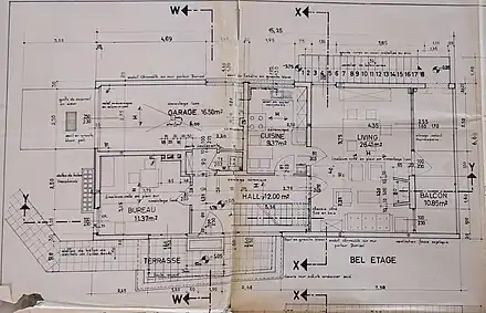 Afin de réduire les coûts, le rez-de-chaussée n'est pas un porte-à-faux en structure métallique. Un soubassement en béton est réalisé, encastré dans le relier de la vallée qui constitue le sous-sol. Un volume parallélépipédique contenant les pièces de vie est posé dessus avec une partie débordant contenant la loggia. Le volume semble plonger vers le paysage et depuis le living ou la loggia, donnant la même impression que le porte-à-faux de la maison Derwael depuis l'intérieur.