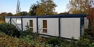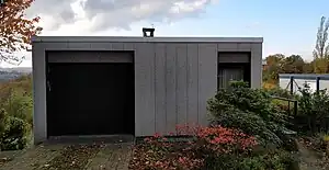 Originellement, la maison a été construite en panneau de Durisol et recouvert d'un enduit chromolithe blanc. Par la suite, les propriétaires ont isolé le rez-de-chaussée par l'extérieur et appliqué un parement en granito aspect béton lavé afin de rester dans le même esprit que le parement d'origine.