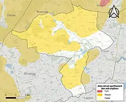 Les mouvements de terrains susceptibles de se produire sur la commune sont des tassements différentiels[18]. Le retrait-gonflement des sols argileux est susceptible d'engendrer des dommages importants aux bâtiments en cas d’alternance de périodes de sécheresse et de pluie[19]. 70,5 % de la superficie communale est en aléa moyen ou fort (54,9 % au niveau départemental et 48,5 % au niveau national)[Carte 2]. Depuis le , en application de la loi ELAN, différentes contraintes s'imposent aux vendeurs, maîtres d'ouvrages ou constructeurs de biens situés dans une zone classée en aléa moyen ou fort[Note 2],[20].